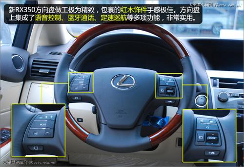 新RX350方向盤做工極為精致,包裹的木質(zhì)飾件手感極佳。方向盤上集成了語(yǔ)音控制、藍(lán)牙通話、定速巡航等多項(xiàng)功能,非常實(shí)用。