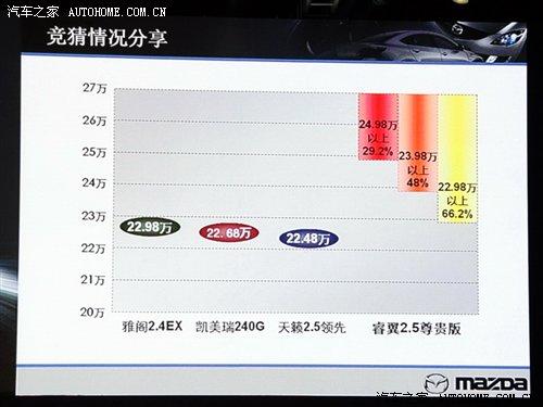 通過睿翼先推2.5L車型的并且老款車型不停產的策略使馬自達6的產品線將會有著十分強大的產品結構,目前市場上面馬自達6最低配車型的成交價(個別地區(qū))已經跌破15萬元,這對于一款合資中型車來說有絕對的優(yōu)勢,新上市的睿翼頂配車型售價為24.98萬元,這使馬自達6的產品線跨越15-25萬元的售價區(qū)間(雖然是新老車型的區(qū)別,對于廠商來說畢竟都是馬自達6系列的產品,畢竟對于商家無論黑貓白貓能抓耗子的就是好貓)。