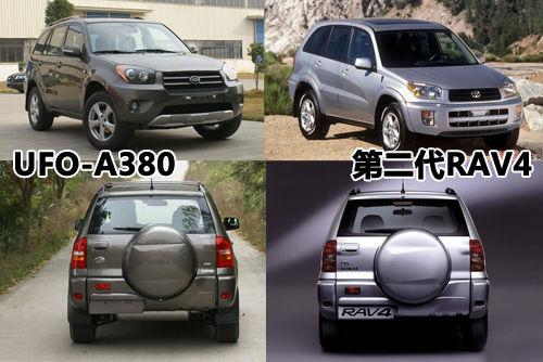 同樣這么做的還有永源UFO-A380,光聽著UFO和A380的威名就已經(jīng)讓人印象深刻了,一看外觀,號(hào)稱“用飛機(jī)的技術(shù)”研制出來的UFO-A380赤裸裸地照搬了第二代豐田RAV4,逼得豐田只好在國內(nèi)直接投產(chǎn)第三代RAV4。