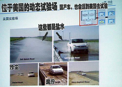 一臺車輛經(jīng)常要行駛在各種各樣的路況條件下,大眾的海外測試基地包括:芬蘭--嚴寒零下40°,一次啟動;美國--腐蝕-暴曬-夏季路試(暴曬試驗場,自主車、零部件,暴曬一年);南非--南北半球日照最強烈地區(qū);每年大眾高層領(lǐng)導(dǎo),都必須要到夏季路試的地方,去親自體驗?zāi)抢锏臉O端環(huán)境,據(jù)說這里在美國的試驗場地白天的體感溫度就有50°之多。