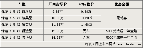 CITY鋒范是本田根據(jù)以中國為代表的全球新興市場的需求而開發(fā)的一款全新車型。鋒范有1.8L 和1.5L兩種發(fā)動機(jī)選擇,均采用Honda獨有的i-VTEC技術(shù)。自上市以來,鋒范的供貨一直比較緊張,而且沒有出現(xiàn)現(xiàn)金優(yōu)惠。近期根據(jù)網(wǎng)上車市價格監(jiān)測系統(tǒng)顯示,鋒范出現(xiàn)了5000元的現(xiàn)金優(yōu)惠。據(jù)4S店銷售人員介紹,目前鋒范1.8排量車型出現(xiàn)了現(xiàn)金優(yōu)惠,消費者購車可以優(yōu)惠5000元現(xiàn)金,或者直接贈送一年的全車保險,價值也在5000元左右。1.5排量仍然沒有出現(xiàn)優(yōu)惠。