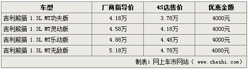 據(jù)銷售人員介紹,吉利熊貓的各款車型現(xiàn)在已經(jīng)可滿足消費者需要。目前主推4.58萬的靈動版和4.88萬的樂動版,兩款車型是銷量最佳的車型,并有試駕車提供給客戶體驗。另外,銷售人員表示,目前購買吉利熊貓系列車型4S最多可以優(yōu)惠4000元現(xiàn)金。