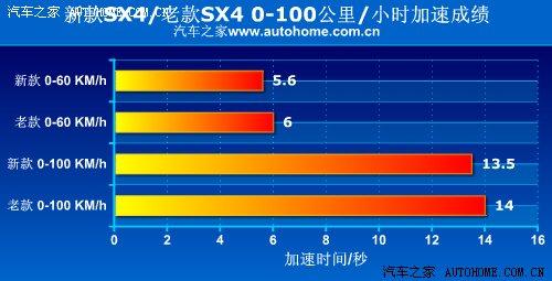 這加速測試中,新款SX4起步時(shí)對(duì)車身姿態(tài)控制不錯(cuò),1.6L AT運(yùn)動(dòng)型的百公里加速最好成績?yōu)?3.5秒,比老款車型的14秒略有提升。不過從絕對(duì)數(shù)值上看,13.5秒仍是一段比較“漫長”的時(shí)間。