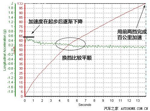 從加速圖表中大家可以看到,1.6L+4AT的組合能夠提供的加速度十分有限,加速G值在起步階段達(dá)到最大后就開始呈現(xiàn)衰弱的趨勢。但值得注意的是,4AT變速箱只用了兩擋就完成了百公里加速,且在僅有的一次換當(dāng)中,其過渡的平穩(wěn)程度也令人滿意,進(jìn)一步證明了SX4在日常駕駛中的平順性。