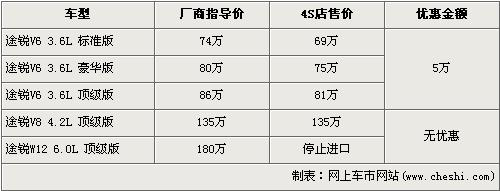 據(jù)經(jīng)銷商銷售人員介紹,途銳的旗艦車型W12缸的6.0L頂配型已經(jīng)停止進(jìn)口。而3.6L的車型有5萬元的優(yōu)惠,最低配的3.6L標(biāo)準(zhǔn)型的售價從74萬元下跌到了69萬元,首次跌破了70萬元。4.2L頂級版由于店內(nèi)沒有現(xiàn)車所以沒有優(yōu)惠,欲購買的消費(fèi)者需交訂金10萬元,約等2個月才可提車。