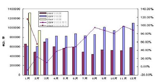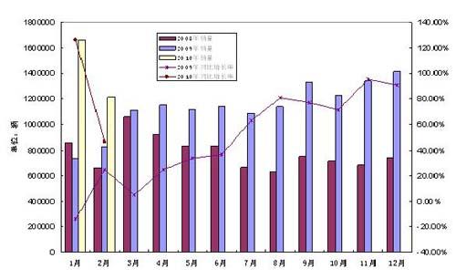 2月,轎車產(chǎn)銷分別為61.83萬輛和62.31萬輛,分別比同期增長48.17%和45.88%。1-2月,轎車的產(chǎn)銷分別為148.14萬輛和155.33萬輛,分別比同期增長88.52%和79.31%。其中,自主品牌轎車?yán)塾?jì)銷售52.51萬輛,占轎車銷售總量的33.81%,比2009年所占比例提升了4.14個百分點(diǎn)。