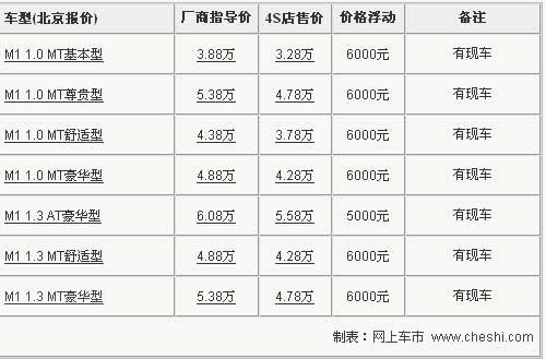 瑞麒品牌所推出的首款車型瑞麒M1,在上市之后,根據(jù)國內(nèi)消費(fèi)者的需求,瑞麒M1在推出1.0和1.3L兩款手動(dòng)檔車型后,又推出了1.3L自動(dòng)檔車型,豐富產(chǎn)品線的同時(shí)給消費(fèi)者更多的選擇余地。近期,網(wǎng)上車市走訪了北京地區(qū)瑞麒4S店,對(duì)瑞麒M1最新的市場情況進(jìn)行了了解,發(fā)現(xiàn)目前瑞麒M1車型全系降價(jià)又有了新高度。