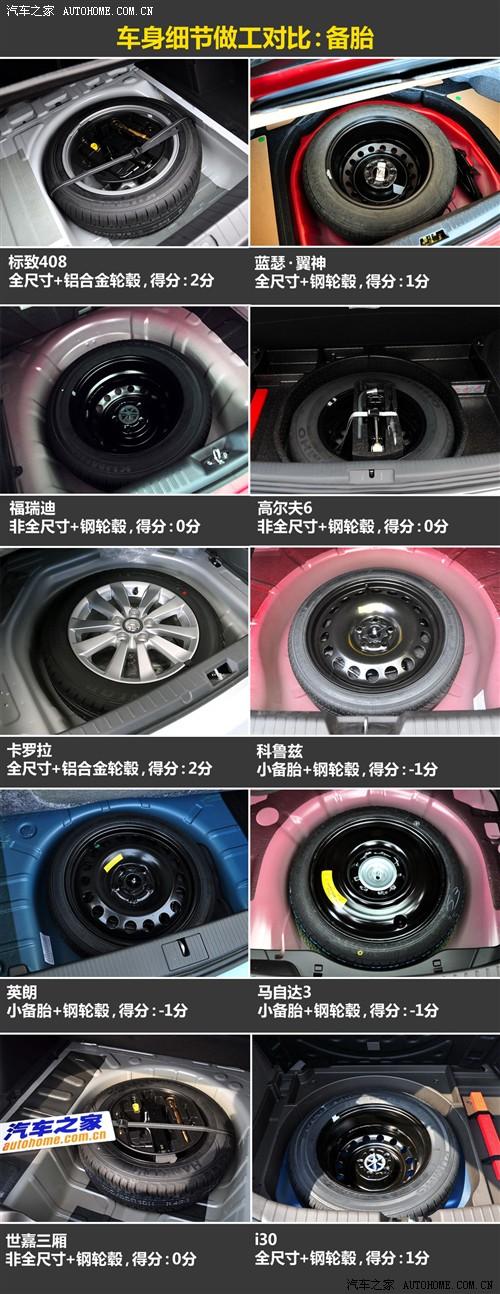 在這一環(huán)節(jié)的對(duì)比中,只有標(biāo)致408和卡羅拉使用了難得一見(jiàn)的鋁合金輪轂,其實(shí)408的低配車(chē)型使用的也是鋼輪轂。其他大部分車(chē)型都是鋼輪轂和非全尺寸備胎,其中值得商榷的就是福瑞迪,他全系都是195mm或者205mm的輪胎,但備胎卻都是185mm,原因當(dāng)然是為了節(jié)約成本。同時(shí),科魯茲、英朗和馬自達(dá)3兩廂使用的小備胎對(duì)于使用有一定的影響,我們必須扣分。