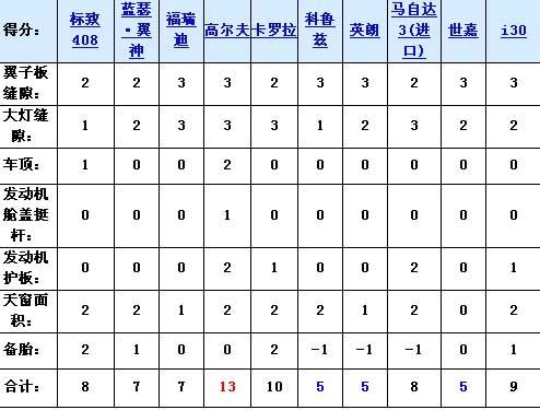不難看出,標(biāo)致408雖然夠大,但他的做工和細(xì)節(jié)并不像看上去那么精細(xì),在10款緊湊型車中僅僅處于中等水平;藍(lán)瑟·翼神各方面中規(guī)中矩,沒有突出的亮點(diǎn);福瑞迪的外觀縫隙控制最出色,但天窗面積和備胎令人不爽;身材最小的高爾夫6因?yàn)榫哂芯?xì)的外部做工,大面積的天窗和發(fā)動(dòng)機(jī)護(hù)板而在外觀方面有一定的優(yōu)勢(shì),同時(shí)他的外觀也是十分招人待見的,只不過不停的減配令人很不爽;卡羅拉中庸但沒有明顯的短板,所以得分也不低;來自于通用集團(tuán)的科魯茲和英朗存在同樣的問題:大燈縫隙有點(diǎn)大,小備胎令人很很懊惱;進(jìn)口馬自達(dá)3如果不是因?yàn)樾涮サ脑,那么成?jī)也不錯(cuò);世嘉除了縫隙控制得還可以以外,其他方面沒有任何亮點(diǎn);i30的表現(xiàn)卻比想象中強(qiáng)大,各方面均衡,成績(jī)僅次于卡羅拉。