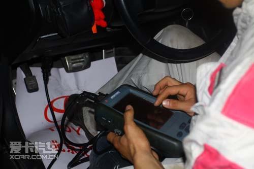 工人用儀器接入到行車(chē)電腦檢測(cè)故障