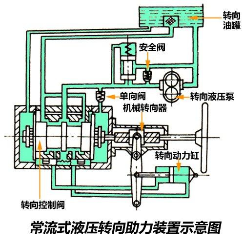 機(jī)械液壓助力系統(tǒng)的主要組成部分有液壓泵、油管、壓力流體控制閥、V型傳動皮帶、儲油罐等等。這種助力方式是將一部分發(fā)動機(jī)動力輸出轉(zhuǎn)化成液壓泵壓力,對轉(zhuǎn)向系統(tǒng)施加輔助作用力,從而使輪胎轉(zhuǎn)向。