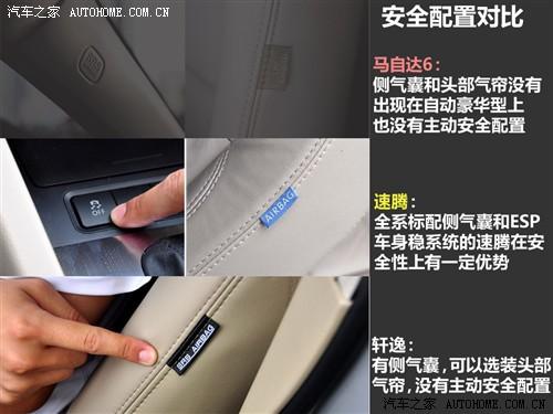 對比配置,我們先從安全性配置開始,在這方面,無疑速騰是最大的贏家,因?yàn)轳R自達(dá)6除了最基本的ABS+EBD和雙氣囊之外,沒有別的更多安全配置;而速騰是全系標(biāo)配ESP和側(cè)氣囊的;軒逸盡管主動(dòng)安全配置沒什么亮點(diǎn),但這款高配車型有側(cè)氣囊,而且可以選裝頭部氣簾,所以還是比馬自達(dá)6更勝一籌。