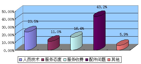 報(bào)告顯示,在汽車(chē)產(chǎn)品服務(wù)質(zhì)量的投訴中,對(duì)配件問(wèn)題、服務(wù)態(tài)度的投訴較上一季度有所增加,對(duì)人員技術(shù)、服務(wù)收費(fèi)的投訴有所下降。其中,久修不好是引發(fā)消費(fèi)者投訴廠家服務(wù)質(zhì)量的最主要原因。具體構(gòu)成比例:人員技術(shù)占23.5%,服務(wù)態(tài)度占11.0%,服務(wù)收費(fèi)占16.4%,配件問(wèn)題占43.2%,其他占5.9%。