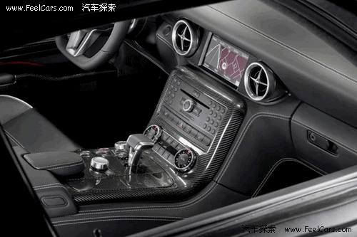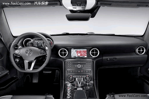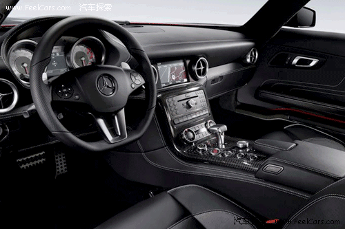 看到內(nèi)飾的第一感覺就是運動感很強,無論是全黑色的真皮內(nèi)飾,還有鑲嵌點綴在各處的碳纖維面板,或者是三輻、平底的真皮方向盤,像瞄準鏡一般的空調(diào)出風口等等,都毫不客氣的顯露出了SLS以運動為本的設(shè)計理念,當然,這也是在向前輩300SL致敬。
