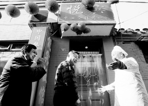 昨日下午,記者來(lái)到翠花胡同內(nèi)的悅賓飯店門(mén)口,正碰見(jiàn)76歲高齡的郭培基老漢穿著白色的廚子衣服,頭戴高高的廚子帽,吆喝著迎接每一位顧客。郭培基說(shuō),過(guò)年了,自己“很興奮”,“闊別十來(lái)年的廚子帽今天特意戴上,就為迎接2008年的春節(jié)!弊哌M(jìn)店內(nèi),郭培基看著擠滿了座位的食客們,高興得合不攏嘴。“百分之九十以上都是我多年的老主顧。”話音未落,一桌顧客大聲求郭老先生白送兩道拿手菜,老郭一口應(yīng)允。一位姓張的顧客說(shuō),他到老郭店里吃飯已有十余年了,“老郭手藝很好,店里的飯菜也很便宜。我們要求賞道菜,老郭從不含糊!”