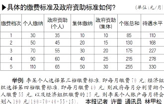 最低的個(gè)人繳費(fèi)標(biāo)準(zhǔn)確定為30元,以20元為級(jí)差,向上設(shè)立五個(gè)檔次的繳費(fèi)標(biāo)準(zhǔn),最高一檔為110元。參保農(nóng)民可根據(jù)各自的經(jīng)濟(jì)承受能力自愿選擇一檔繳費(fèi),多繳多得。《辦法》對(duì)經(jīng)濟(jì)組織設(shè)計(jì)了5個(gè)檔次的繳費(fèi)標(biāo)準(zhǔn),從10元至50元不等;對(duì)于確無(wú)經(jīng)濟(jì)能力的經(jīng)濟(jì)組織,也可以暫不為參保人繳費(fèi)。