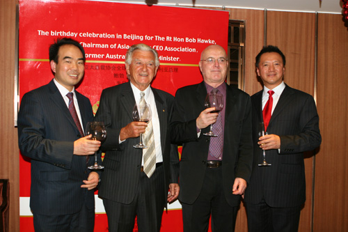 中新網(wǎng)12月10日電 12月9日晚,著名國際經(jīng)濟(jì)組織亞太總裁協(xié)會(huì)在典雅的北京中奧馬哥孛羅大酒店舉辦了一場別開生面的生日慶典,慶祝享有“APEC之父”美譽(yù)的澳大利亞前總理鮑勃•霍克先生的生日。