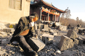 進(jìn)入山門(mén)內(nèi),一座壯觀(guān)的金頂大雄寶殿坐北朝南,院內(nèi)一片繁忙景象,50多位石匠正在用老式的打石方式,一塊一塊擊打著青石,切好的石塊被抬到大雄寶殿一東一西在建的兩座建筑上。