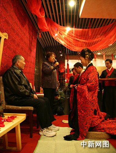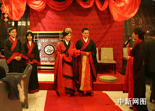 中新網(wǎng)1月20日電 1月19日晚,北京一對(duì)新人舉行了一場(chǎng)莊重典雅的漢民族傳統(tǒng)婚禮——周制婚禮,新人服飾、現(xiàn)場(chǎng)布置和儀程設(shè)計(jì),均以自周流傳至秦、漢的婚俗為依托。