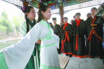 兩名女大學(xué)生正在展示漢服。昨日,20多名女大學(xué)生相聚清華大學(xué),她們身著傳統(tǒng)漢服,演示了古代女子的成人禮———笄禮。女學(xué)生們進(jìn)行了三次叩拜,拜天地、拜父母、拜祖國;三次加裝,服飾一次比一次華貴,象征女子成長的過程。最后經(jīng)過上香、敬酒等多個(gè)程序,成人禮才宣告結(jié)束。笄禮是古代女子訂婚以后、出嫁之前所行的禮,目的是對她們的人生責(zé)任、社會角色進(jìn)行提醒。