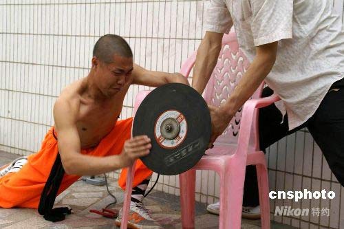 記者在比賽場上看到,當(dāng)胡瓊拿著一把鐵鉗貼向高速運(yùn)轉(zhuǎn)的切割機(jī)時,頓時火星四濺。只見胡瓊扎上腰帶,凝神運(yùn)氣,大喝一聲后伸用手抓向切割機(jī),切割機(jī)立即停止了運(yùn)轉(zhuǎn)。連續(xù)兩次表演都非常成功,目瞪口呆過后的觀眾報以熱烈的掌聲。