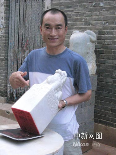 據(jù)了解,“平安中國印”由曲陽縣著名藝人龐少賢歷時兩個月手工雕刻而成。龐少賢說,印章在中國傳統(tǒng)文化中代表著吉祥和平安。今年在中國發(fā)生了冰凍災(zāi)害及汶川大地震等自然災(zāi)害,國家和人民損失重大。作為一名雕刻藝人,他決定做一枚“平安中國印”,以此來祈福中國吉祥、平安。