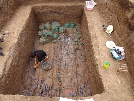 位于南陽市中心城區(qū)八一路與工業(yè)路交叉口西北角一施工工地7月10日發(fā)現(xiàn)一大型古墓群。因出土有數(shù)目眾多的“文物財寶”,南陽警方每天出動多名持槍警察,在現(xiàn)場武裝警衛(wèi),禁止無關人員進入。