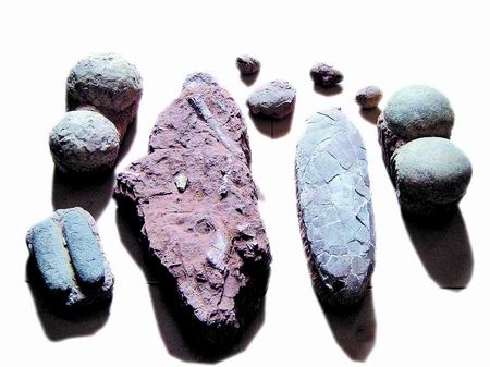 “這是村民們開(kāi)山修筑趙營(yíng)村至金花村‘村村通’公路時(shí)發(fā)現(xiàn)的!睆堌S臣說(shuō),“目前,僅新修公路沿線兩公里范圍內(nèi)就發(fā)現(xiàn)有二十多窩這樣的恐龍蛋化石,估計(jì)實(shí)際蘊(yùn)藏量不下100窩。同時(shí)還發(fā)現(xiàn)了樹枝蛋、戈壁棱柱形蛋等十多種恐龍蛋化石!痹诖宀浚瑥堌S臣向記者展示了臨時(shí)保存的修路施工中拾到的蛋化石和龍骨化石。