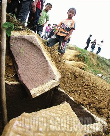發(fā)現(xiàn)古墓的工人易德忠不停地拿著相機轉悠,見到記者他遺憾的說,“為了保護墓室,我們已按要求回填了泥土,恐怕在發(fā)掘完成前,你都見不到有著大柱子、梯步的墓室和精美的墓門板咯!惫拍谷含F(xiàn)場,記者只見到了未被封嚴的墳墓洞口,其上已經放置了大石板。墓里淌滿了水,但沒有異味。