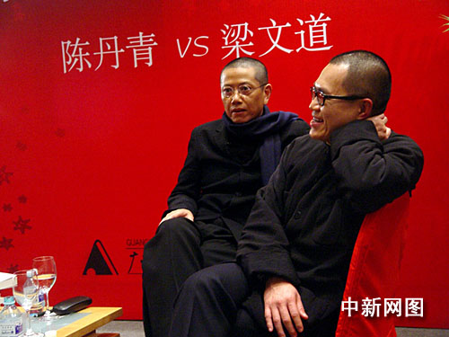在介紹完兩位的新書后,主持人讓二人在春節(jié)前向讀者打個招呼。陳丹青說:恭喜發(fā)財。梁文道言:江山盡好,歲月無聲。陳丹青講藝術(shù)里面有一個特別的用法叫“并制”,他們兩個并制到一起有很特別的效果。因為兩位都是光頭,形象非常相似。以前陳丹青上節(jié)目喜歡穿中式的黑色衣服,昨天改穿西裝。陳丹青解釋說:“這些年已經(jīng)不穿了,因為總問你為什么穿這個,總要回答多少次,很煩就不穿了�!绷何牡佬ΨQ:“這是山寨版的陳丹青�!�