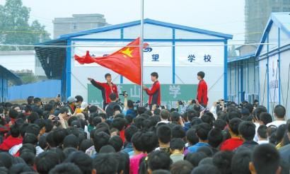 5月6日,蘆山中學(xué)的同學(xué)們在已經(jīng)建成的板房教室邊舉行升旗儀式。