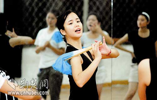 彎腰,擺頭,腳尖點地,滑步……伴著古意濃濃的音樂,七名女孩翩翩起舞,優(yōu)美的身姿讓人的目光不禁久久停留。“這不是‘魔女幼熙’么?”記者眼前一亮:領(lǐng)舞者長相頗似熱播韓劇《魔女幼熙》的主角。隨意的小卷發(fā)披在肩頭,忽閃忽閃的長睫毛下,大眼睛顧盼生輝,這個“魔女幼熙”名叫黃蓓,武大新聞與傳播學(xué)院大三學(xué)生。每晚給一群將參加“藝考”的高中生上舞蹈課,是她這個暑假的兼職工作!翱辞宄,像我這樣,兩手伸直,腰一定要用力彎下去……”從學(xué)生的熱身準備,到舞蹈中的每個細節(jié)乃至眼神,黃蓓都頗為專業(yè)地逐個糾正。兩小時的教學(xué)時間里,她說得最多的一句話是“再來一遍”。在幫助學(xué)生做拉伸動作時,有的初學(xué)者疼得哇哇叫,她也毫不心軟,“怕疼是學(xué)不好舞蹈的。”