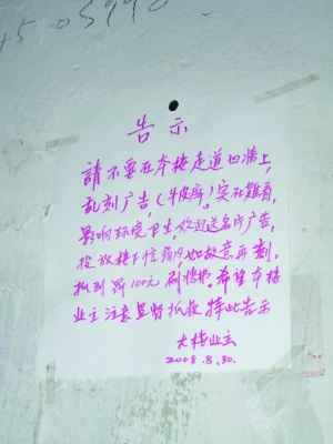問起這張告示是何人張貼,住在樓里的居民告訴記者,有可能是住在樓里的一對(duì)老夫妻張貼的,他們特別熱心,經(jīng)常義務(wù)刷墻,八成是急了,寫成文字提醒那些小廣告印刻者注意,這也是無奈之舉啊。“別看這幾層樓道現(xiàn)在白凈凈的,可過幾天再一看,馬上又變成了花花綠綠的大花臉了,看得人頭直發(fā)暈。”