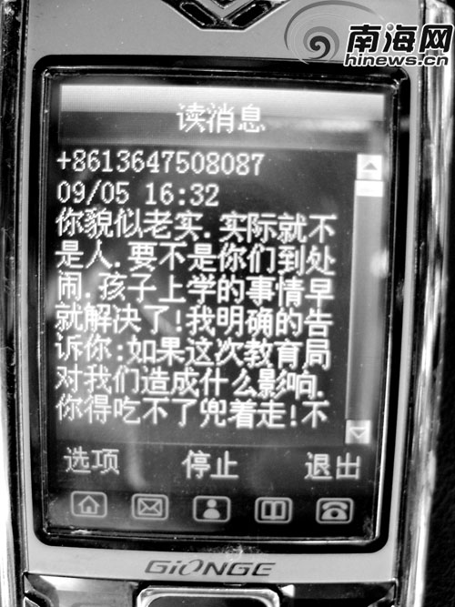 王才子給記者看了王校長辱罵他的短信。記者看了其中一條短信內(nèi)容:“你貌似老實(shí),實(shí)際就不是人,要不是你們到處鬧,孩子上學(xué)的事情早就解決了!我明確告訴你,如果這次教育局對我們造成什么影響,讓你吃不了兜著走!”另一條短信內(nèi)容是:“象你這種貪得無厭的人,不但不想讓你孩子上好學(xué)校,還想拿孩子來賺錢,等我忙完了這整(原文如此——記者注)子,會(huì)找人跟你算清楚的!”