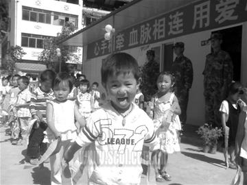 5·12地震時,龍門山鎮(zhèn)幼兒園100多名孩子正在幼兒園午睡,5名老師冒著生命危險將他們?nèi)繐屃顺鰜,但校舍卻成了危房。“再苦不能苦孩子!”在龍門山鎮(zhèn)參加救援的廣州空軍官兵知道后,立即著手為孩子們重建樂園。