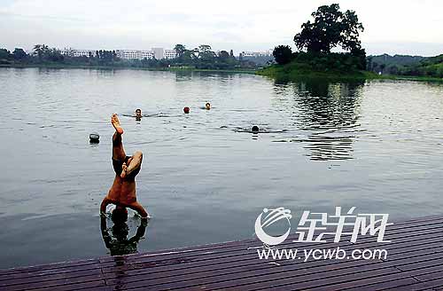 一位剛從水里鉆出來的學(xué)生證實(shí)了上述推斷:“不少市民傍晚會專門開車來這里游泳,周末岸邊都停滿了外面來的小車!彼f,學(xué)校的游泳池開放時間有限制,而且要收費(fèi),自認(rèn)為“水性好”的同學(xué)都樂意到中心湖游泳,“只要不下雨,這里的‘人氣’都很旺”。