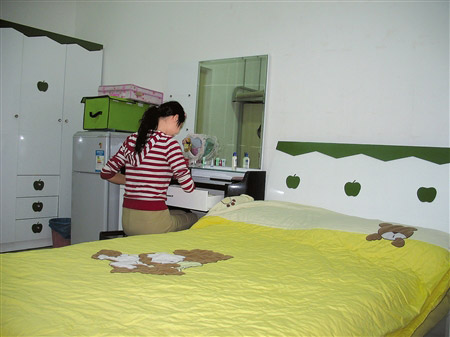 10平方米的屋子擺放著一張雕花大床、全套粉紅色電腦桌、梳妝臺和衣柜,空調(diào)、冰箱和電飯煲等生活家電齊備,墻壁上花狀壁燈和各式各樣裝飾品仿佛透露了這間房的“主人家”是個年齡不大的姑娘……如果不是從四川某高校女生宿舍樓大門進來,記者都不敢確定應(yīng)該用“學(xué)生宿舍”還是“賓館套房”為這間屋子定名。