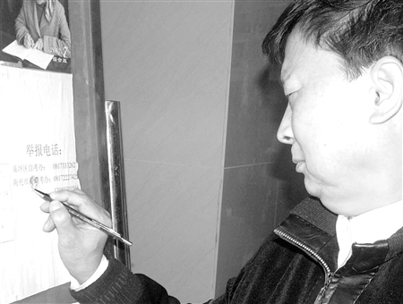 在高坪區(qū)教育局辦公大樓一樓大廳右側(cè),擱了一塊公示欄。公示欄中央,寫著“082次自考公示欄、南充市高坪區(qū)高等教育自學(xué)考試委員會辦公室”等黃底黑色大字。公示欄上面粘貼的內(nèi)容有四川省第082次自學(xué)考試高坪區(qū)高坪中學(xué)考點(diǎn)二區(qū)考點(diǎn)考場安排表等,在公示欄右側(cè)中央,是舉報電話及單位:舉報電話:高坪區(qū)自考辦:0817333××××。南充市看破考辦:0817222××××。為了引起考生注意及顯示自考的嚴(yán)肅性,舉報電話及單位的字體很大,一目了然。