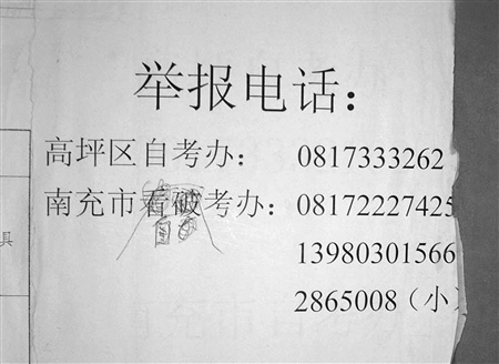 記者查了南充市黨政機(jī)關(guān)電話號碼簿,沒有發(fā)現(xiàn)這單位。記者按公布的投訴電話撥過去,被告知“我們不是看破考辦”。高坪區(qū)自考辦在教育局辦公大樓二樓,記者又趕到高坪區(qū)自考辦!啊铣涫锌雌瓶嫁k’根本不存在,怎么會有這個單位?”自考辦干部陳老師說。