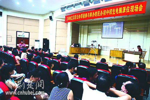 輕點(diǎn)鼠標(biāo),投影屏幕上一道綠色的橫線不停地跳動(dòng),一個(gè)個(gè)學(xué)生名單隨之產(chǎn)生……昨日上午,武漢市15所改制初中轉(zhuǎn)為民辦學(xué)校后,首次舉行“小升初”擇校生電腦派位。