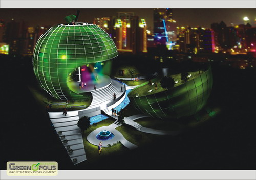 羅馬尼亞國家館的蘋果外形和標志文字“GREENOPOLIS”體現(xiàn)了健康生活方式的重要性、對可持續(xù)發(fā)展理念的關(guān)注以及針對現(xiàn)代社會普遍存在問題的以知識為本的解決方案。