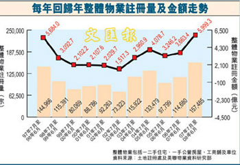 至于注冊(cè)金額方面,劉嘉輝表示,回歸第11年共錄得5999億元,較前一回歸年3663億元急增63.8%,與宗數(shù)同樣創(chuàng)回歸后新高。若與樓市最差的回歸第6年相比,金額更是當(dāng)年近4倍。