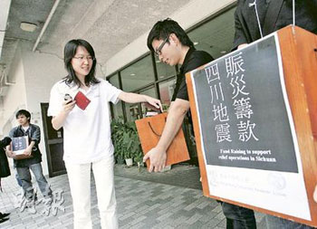 四川周一發(fā)生大地震后,多個(gè)志愿團(tuán)體實(shí)時(shí)開(kāi)設(shè)戶口,發(fā)起大型籌款活動(dòng),市民捐款十分踴躍,香港紅十字會(huì)表示,截至14日下午6時(shí),已籌得5500萬(wàn)元善款,其中匯豐慈善基金已捐出1000萬(wàn)元人民幣。
