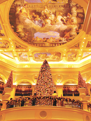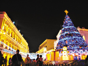 澳門的議事廳前地那一棵足有兩三層樓高的許愿樹燈飾會讓你眼前一亮,一層層藍(lán)盈盈小燈密密圍著,絲毫不會露出光裸電線,底下是制作頗為精細(xì)的大雪人,禮物堆,可愛得幾乎每個經(jīng)過的路人都忍不住要掏出手機(jī)去拍一張,小孩子更不用說了,嚷嚷要媽媽放開手好讓他爬上去拆禮物,看得人忍不住要會心微笑。然后郵政局門口那一棵許愿樹也十分華麗,而且是很別出心裁地“長”在了大門口,叫進(jìn)出的人都覺得自己是在天使庇佑之下似的,忍不住要在心里許個小小愿望。即使是在普通的非鬧市區(qū),馬路上也掛上了串串燈飾,顯得氣氛特別濃。至于各大娛樂場所里面的許愿樹,更是一棵賽一棵的漂亮,一層樓高的是小意思,兩層樓高的是普通規(guī)模,最夸張的是威尼斯人度假村,幾乎每隔一段距離就有一棵或大或小的許愿樹,上面還很細(xì)心地掛滿了蝴蝶結(jié)、許愿球、小禮物、小襪子……看得人又忍不住要掏手機(jī)來玩自拍,不過即使一棵一張,估計(jì)即使是512M的卡都會不夠用呢。
