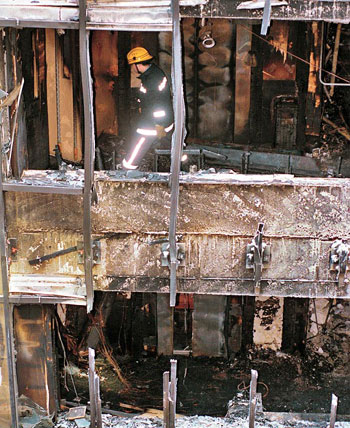 大火撲滅后,消防員進入火場調(diào)查。(圖片來源:蘋果日報)