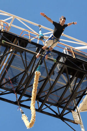 南非擁有世界上最高的蹦極點(diǎn),熱衷蹦極的人們常常在南非找刺激。近日,一位另類的蹦極手創(chuàng)下了蹦極運(yùn)動(dòng)的新紀(jì)錄:37歲的葡萄牙男子卡爾·迪奧尼西奧用1.85萬(wàn)個(gè)安全套做成30米長(zhǎng)的彈性繩,代替?zhèn)鹘y(tǒng)尼龍繩跳下蹦極臺(tái),將“生死一線牽”的感覺(jué)發(fā)揮到極致。
