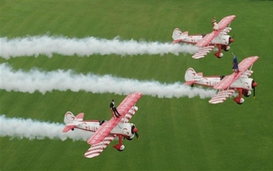 23歲的新娘Katie Hodgson和24歲的新郎Groom Darren McWalters分別站在兩架相同的飛機(jī)機(jī)翼頂上,同時(shí)Rev. George Bringham站在另一架飛于他們前面的飛機(jī)上通過空中通信系統(tǒng)主持了他們的婚禮。