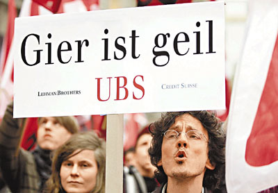 瑞士工會(huì)會(huì)員23日游行到瑞士銀行集團(tuán)總部,要求銀行高層退還大額花紅。