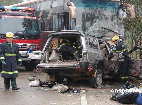 三月二十七日六點四十分,廣西柳州市鹿寨縣寨沙鎮(zhèn)發(fā)生特大交通事故,一輛從貴州開往廣東的小車與一輛大客車迎面相撞,造成小車上包括司機在內(nèi)的六男四女共十人當(dāng)場死亡,另外兩男子受重傷。中新社發(fā) 覃俊鋒 攝