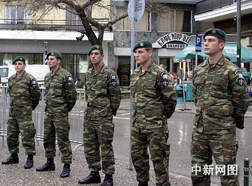 3月27日,北京奧運(yùn)圣火希臘境內(nèi)傳遞第四天,山城納烏薩迎來(lái)第一個(gè)慶典儀式。當(dāng)?shù)夭筷?duì)派出軍人維護(hù)儀式會(huì)場(chǎng)治安。中新社記者:王歡